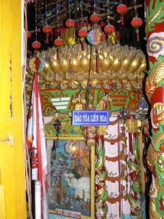 Bước về phía Đông, chánh điện ở đó. Theo phong tục của người Hoa, mặt sảnh tiền của chùa hướng về phía mặt trời mọc. Ta thấy trước ba bệ thờ lớn là ba bộ đỉnh, cao ngang đầu người, bảy bộ hương nghi ngút khói thơm, ba đôi đèn cầy (nến) trong đó có 2 cặp mà mỗi cây được đổ, đắp đến 200 kg sáp, phía ngoài khảm thêm chữ và hình rồng vàng lúc ẩn, lúc hiện uốn lượn theo thân đèn. Cặp còn lại mỗi cây 100 kg đã trên 40 năm qua được đốt lên thường xuyên trong những ngày cúng kiếng, lễ tết mà vẫn chưa cháy hết được 1/2 cây .