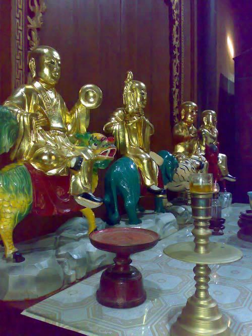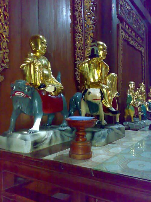 Mỗi vị La hán cưỡi trên lưng một con mãnh thú, tay cầm bửu bối, tượng trưng cho các giác quan mà giáo lý nhà Phật gọi là “lục căn” (mắt, tai, miệng, mũi, thân và ý, ở ba thời quá khứ, hiện tại và vị lai). Đáng tiếc là tượng 18 vị La hán (không giống 18 tượng La hán của các chùa ở miền Bắc), đỉnh cao của nghệ thuật tạc tượng tròn của khu vực đồng bằng sông Cửu Long, đã “bị” thếp vàng nhằm bảo quản cho tốt!