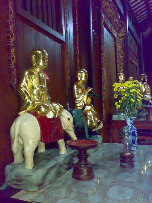 Hai bên tường chánh điện là bàn thờ Thập điện Minh vương Bồ tát. Đặc biệt là bộ Thập bát La hán đặt hai bên điện Phật. Bộ tượng này do tài công (thợ) Nguyên cùng học trò chạm khắc mang nét riêng của khu vực vào năm 1907. Mười tám pho tượng La hán tạc bằng bằng gỗ mun, mỗi tượng cao khoảng 0,8m, bề ngang gối là 0,58m.