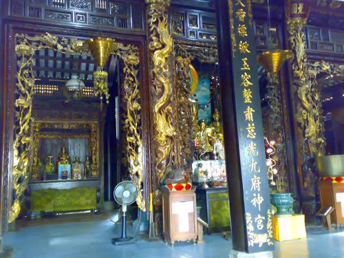 Phía trong gian chính điện và nhà tổ làm theo kiểu Trung Quốc nhưng vẫn giữ được nét kiến trúc Việt Nam, nối hai gian này là một khoảng nhỏ có hòn non bộ ở giữa, hòn non bộ này phác họa lại cảnh thiên nhiên sinh động mang bản sắc Việt Nam, điều đó chứng tỏ rằng tổ tiên ta nhễ muốn đưa thiên nhiên vào tận nhà. Đúng trên hòn non bộ nhìn về mặt sau gian chánh điện, hai bên nhà cầu, mặt trước nhà tổ, ta sẽ thấy lối kiến trúc Rôma với những hàng đá hoa màu sắc sặc sỡ của Pháp được trang trí trên thành nóc, trên những cột xây bằng xi măng kiểu cách.